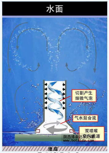 旋流曝氣器在工作過程中,氣體從底部法蘭口進入后從緊貼鐘型曲面的 2 個噴嘴噴出形成旋流效果,以極快的速度沿著鐘型壁面向上加速回旋。由于鐘型上側(cè)漸漸狹窄,空氣獲得極大的加速度和沖擊力。 由于氣體作用,混合液在筒內(nèi)、外循環(huán)流動,氣液上升過程中,被筒內(nèi)部結(jié)構(gòu)多次碰撞切割,形成大量超微氣泡,且與周圍的泥水混合物充分混合,增加了氧氣的傳質(zhì)速率和氧利用率;充分混合的氣水猛力向上沖出,強烈的循環(huán)水流使部分小氣泡和水流返回池底,同時使底部淤泥參與循環(huán),因而整個曝氣池內(nèi)無充氧盲區(qū),實現(xiàn)了曝氣池容積利用最大化。(見圖3)