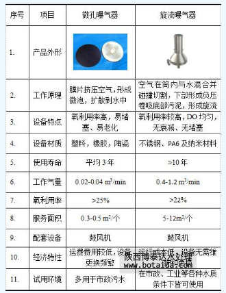 由于兩種曝氣設備的工作原理、生產(chǎn)材質(zhì)不同,故兩種曝氣器在性能上有很多不同點。具體不同點見表1。