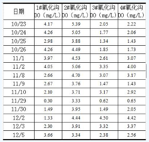 本項目于2017年9月底正式完成改造工程。其中1#、2#氧化溝采用了停水清池,底部安裝固定的方式,安裝了新的微孔曝氣器,3#、4#氧化溝采用了帶水作業(yè)的方式,安裝了新的旋流曝氣器。具體運行數(shù)據(jù)見表2、 表3。