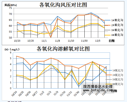 旋流曝氣器會卷吸起底部的泥水混合物,旋流曝氣器會將藏在底部污泥中的部分有機物進一步消化分解,故在運行初期,旋流曝氣器產(chǎn)生的一部分溶解氧用來消解底部的污泥。故在運行初期,安裝旋流曝氣器的3#、4#氧化溝溶解氧不高。隨著旋流曝氣器的穩(wěn)定運行,池底堆積的污泥進一步消解,氧化溝中額溶解氧進一步上升。博泰達預測,在未來數(shù)月內(nèi),3#、4#氧化溝內(nèi)的溶解氧會繼續(xù)上升,直至底部污泥消解殆盡。