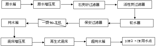 6、原水箱→原水增壓泵→石英砂過濾器→活性碳過濾器→軟水器→保安過濾器→反滲透系統(tǒng)→純水箱→混床增壓泵→超純水箱→10MΩ.CM用水點